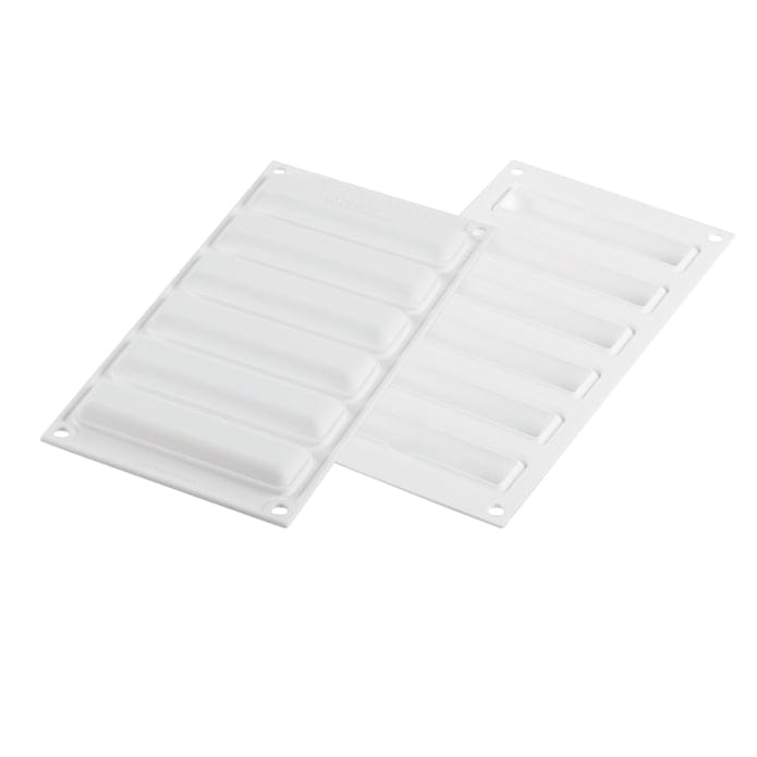 Kit Tarte ring rektangulær 120x35mm fra Silikomart er et kit bestående af 6 rektangulære tartelletteringe og en silikoneform med 6 støbninger pr. måtte.