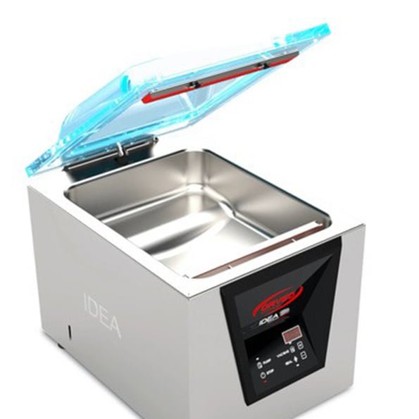 En meget hurtig vakuummaskine med de bedste funktioner på markedet. Idea 30 er den eneste maskine i sin prisklasse, der er specielt designet til at vakuumemballere væsker. Idea 30 har sensorstyret “liquid control” som standard, hvilket gør, at den fjerner 96% af ilten i stedet for 90%, som en almindelig maskine gør med væsker. Den er udstyret med tømmefunktion af pumpen, hvilket eliminerer de fleste problemer, der kan opstå, når man vakuumemballerer flydende og varme fødevarer. Du kan vakuumemballere meget store fødevarer, takket være at poser også kan vakuumemballeres uden for kammeret. Det er nemt at skifte svejsebånd & lister, osv. Ekstremt let at holde ren takket være det strømlinede design. Den sensorstyrede vakuummaskine Idea 30 er kompakt, ergonomisk og udstyret med et sensorisk vakuumtryk. Sensorisk vakuumtryk findes kun i dyre maskiner normalt og betyder, at du indstiller trykket, når det skal stoppe i stedet for tid. Dette sparer motor/pumpen og gør, at det går hurtigere, og du får altid et godt resultat. Idea 30 er udstyret med en vakuumpumpe der gør den ekstremt hurtig i forhold til lignende maskiner på markedet.