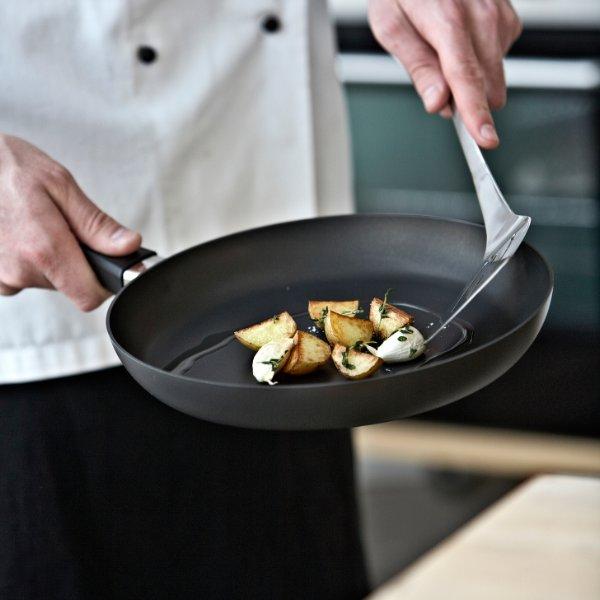 Panden er fremstillet i støbt aluminium for optimal varmefordeling og har et ergonomisk, faststøbt håndtag, der tåler både høje temperaturer og langvarig brug.